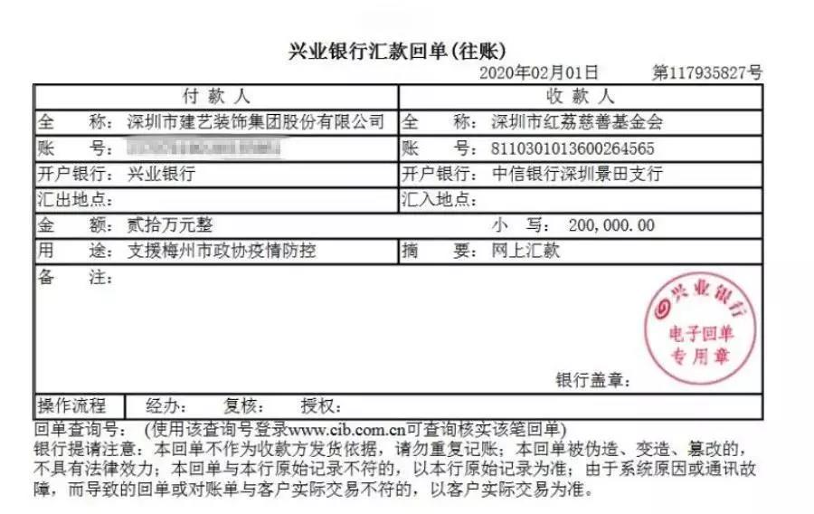2月1日,建艺集团分别向梅州市政协及兴宁市人民政府捐款20万元及10万元,积极为梅州地区疫情防控提供帮助。截至目前,建艺集团已累计捐款80万元用于疫情防控。