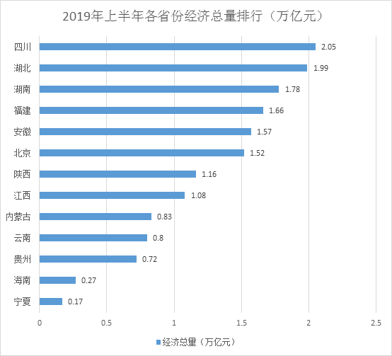 从经济总量上看,与往年半年报相比,四川今年首次突破2万亿元大关,以经济总量2.05万亿元领跑13省份。湖北以1.99万亿元的成绩暂列第二。宁夏上半年GDP为0.17万亿元,同比增长6.5%,总量暂时垫底。